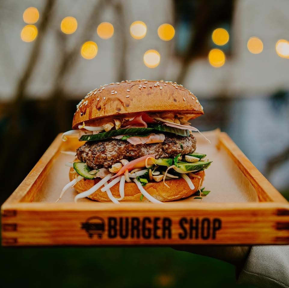 10 x Wołowina, sos aioli, bułka brioche, sałata, pomidor, czerwona cebula, domowe pikle.