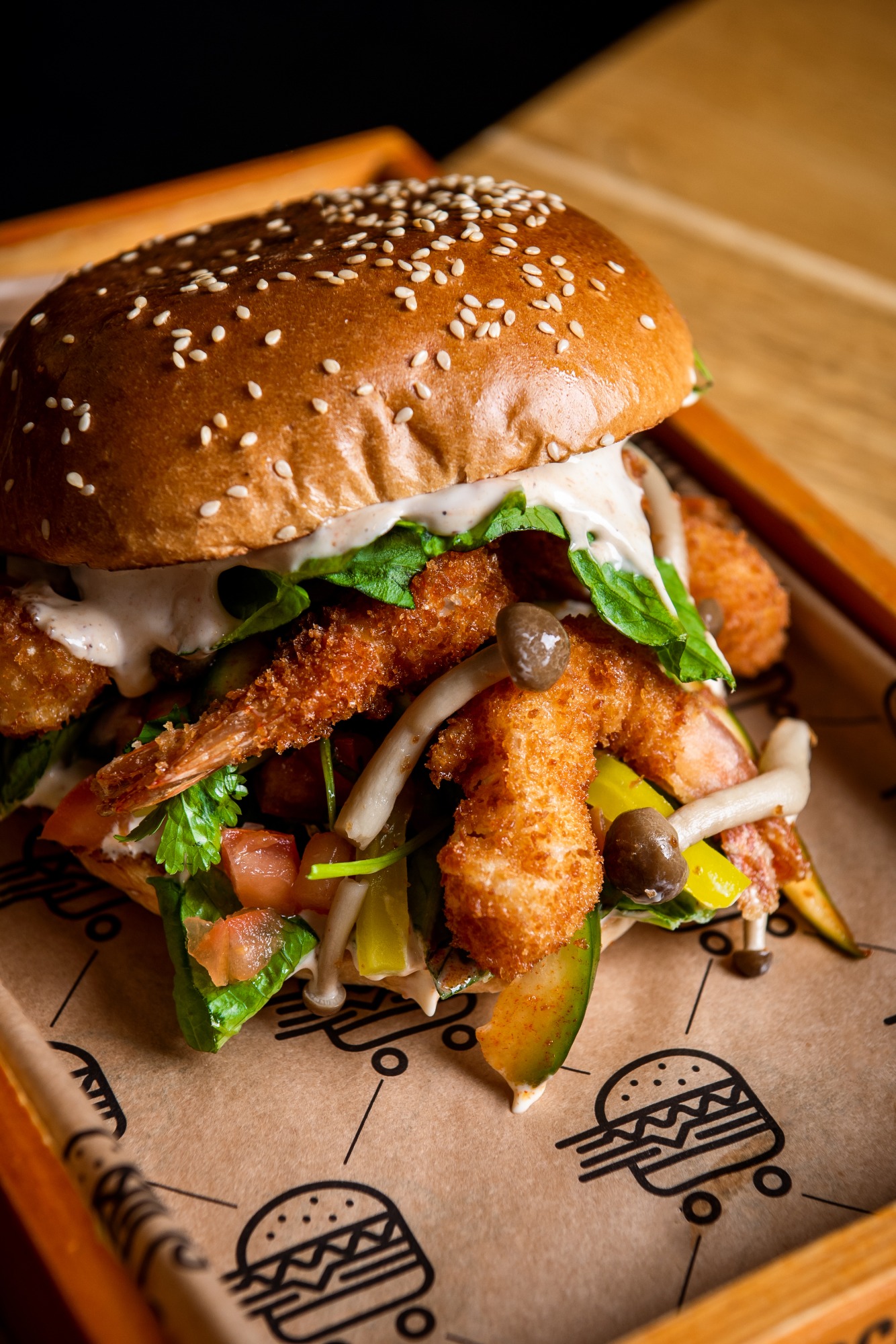 5 x Strips, sos aioli, bułka brioche, sałata, pomidor, czerwona cebula, domowe pikle.